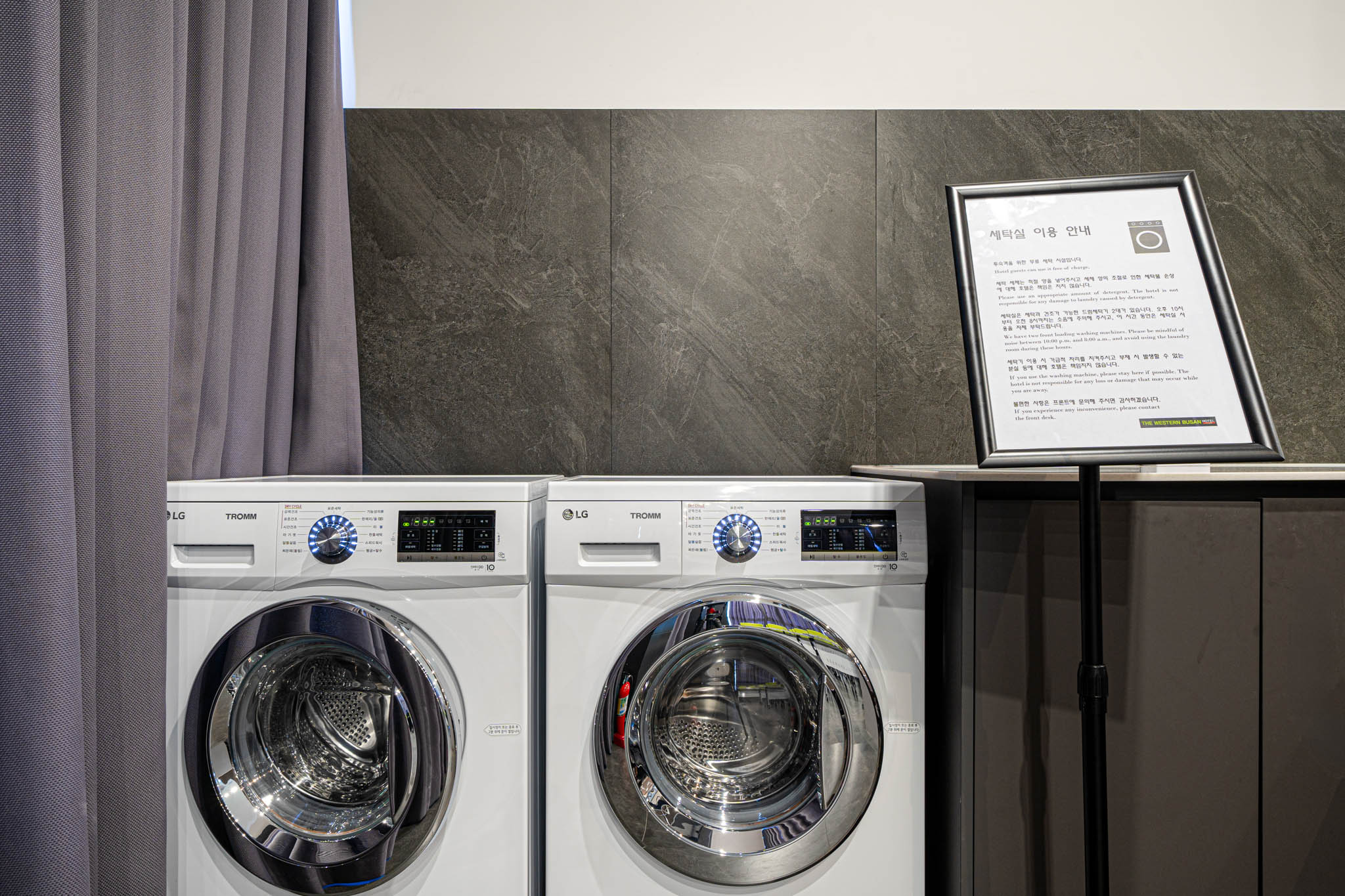 라인형 집+화살표+텍스트 네비 부대시설 freelaundry 'the western free laundry' 더웨스턴 무료 세탁 공간에서는 투숙객이 간편하게 옷을 세탁하고, 여행 중에도 깔끔함을 유지할 수 있습니다. 세탁기와 건조기가 완비되어 있어 언제든 자유롭게 이용 가능하며, 사용법도 간단해 혼자서도 손쉽게 관리할 수 있습니다. 바쁜 여행 중에도 여유롭게 머무르며, 깔끔하게 준비된 옷으로 하루를 시작하세요. 고객 전용 무료 세탁 공간 | 2F | 운영시간 | 24h* 자세한 내용이나 문의는 프론트 데스크로 문의해 주시기 바랍니다.* 이용 시간 및 공간은 호텔 사정에 따라 변경 혹은 제한될 수 있습니다.* 본 세탁공간은 투숙객 전용 공간으로, 외부 고객의 이용이 제한될 수 있습니다. 또한 행사 또는 시설 점검 등의 사유로 일시적으로 이용이 제한될 수 있으니 너른 양해 부탁드립니다. 행사 | 기타 대여 contact | 호텔 프론트 mail : thewesternbusan@stayneo.com tel : 051-711-1090